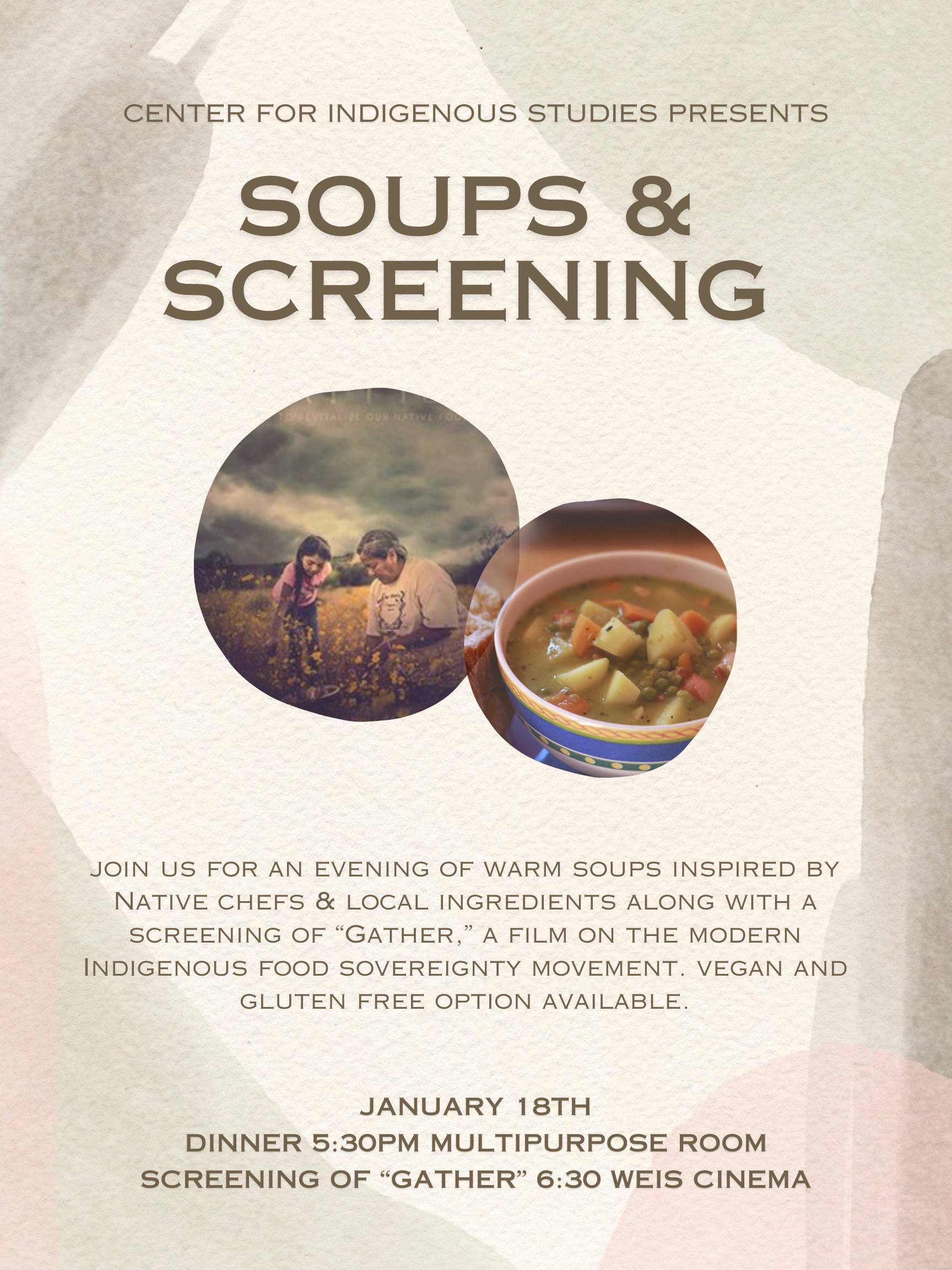 Join us for an evening of warm soups inspired by Native chefs and local ingredients along with a screening of Gather, a film on the modern Indigenous food sovereignty movement. Vegan and gluten free option available.