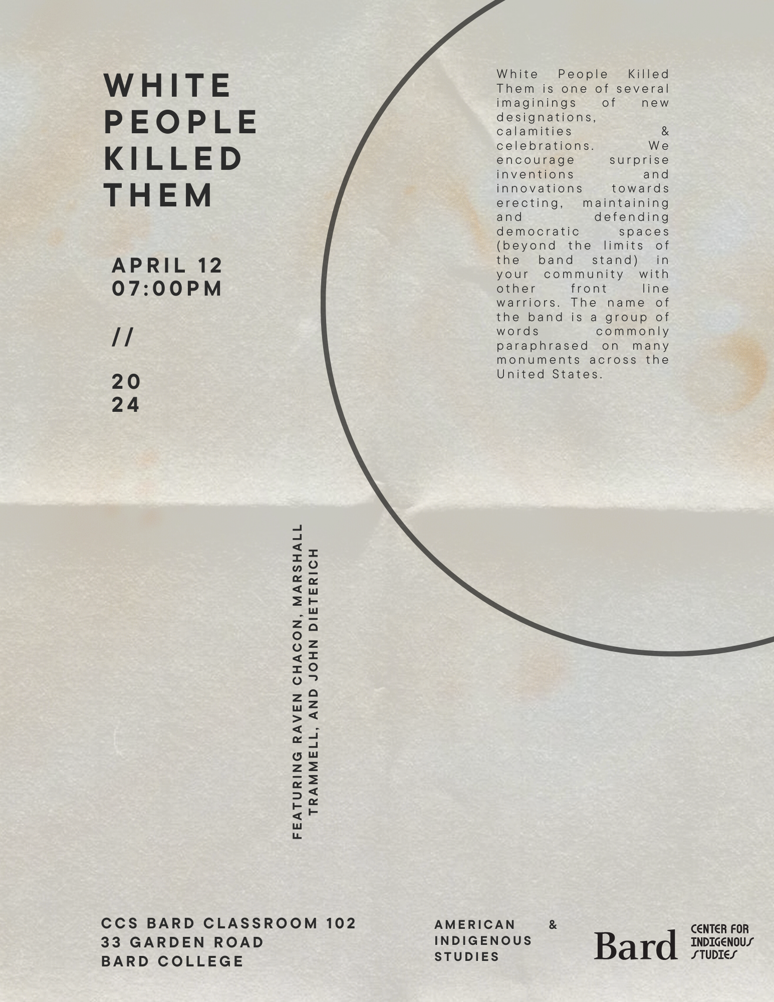Please join American and Indigenous Studies and the Center for Indigenous Studies for a workshop with our guest composers and performers Raven Chacon, Marshall Trammell, and John Dieterich. Their group, White People Killed Them, is one of several imaginings of new designations, calamities, and celebrations. We encourage surprise inventions and innovations towards erecting, maintaining, and defending democratic spaces (beyond the limits of the band stand) in your community with other frontline warriors.